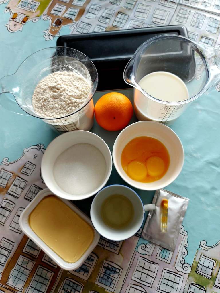 Am pus în primul rând laptele la microunde să se încălzească; după aceea am adăugat zahărul amestecând continuu în lapte până ce acesta se topește; presar sarea peste gălbenușurile de ou pentru a le da un plus de culoare și dau portocala prin răzătoare; într – un bol încăpător cern făina peste care adaug toate ingredientele, mai putin untul și uleiul; de ultimele două mă ajut la final de frământare, pentru a ajunge la textura potrivită. În maxim 10 minute tanti coca este gata de pus la dospit pentru o oră; când și – a mărit volumul de două ori, am turnat – o pe blatul de lucru și am tăiat – o în două părți egale, după care am întins fiecare parte cu mainile în formă de dreptunghi cu o lungime de tavă; poate vă ajută imaginile de mai jos să vizualizați mai bine reproducerea cuvintelor mele.