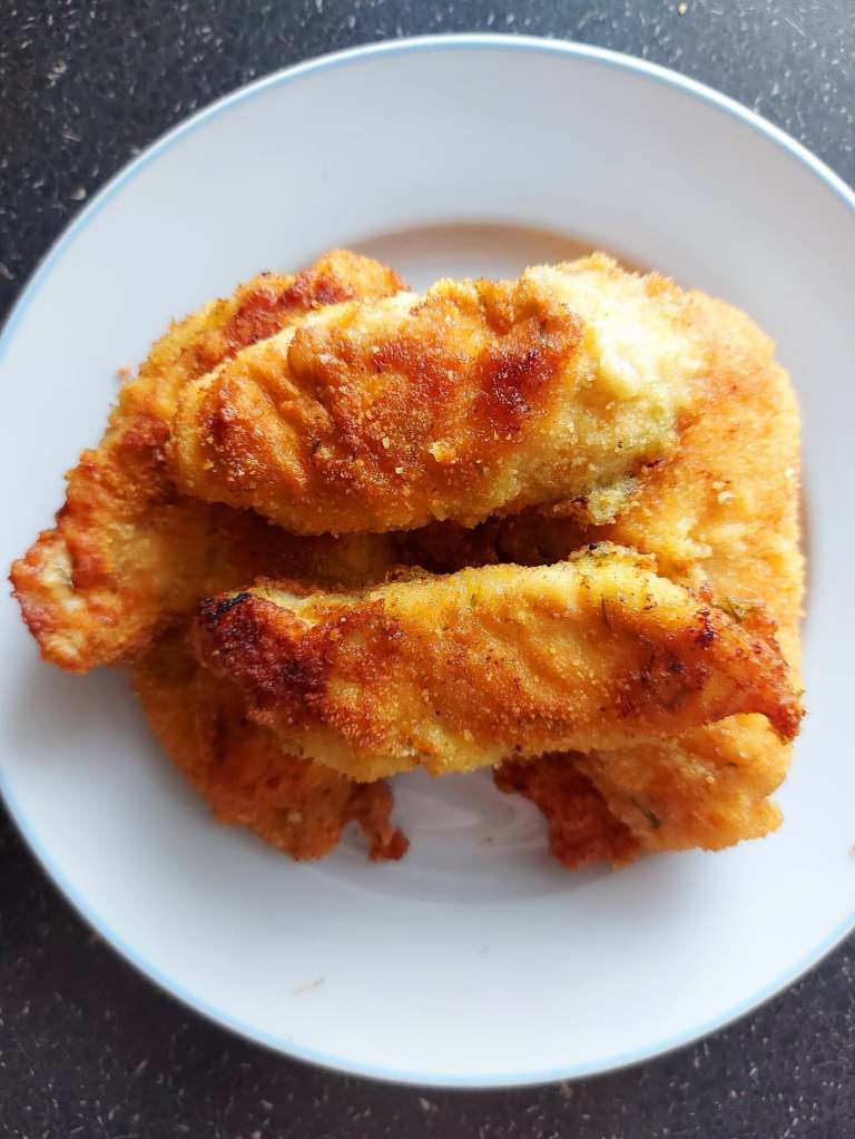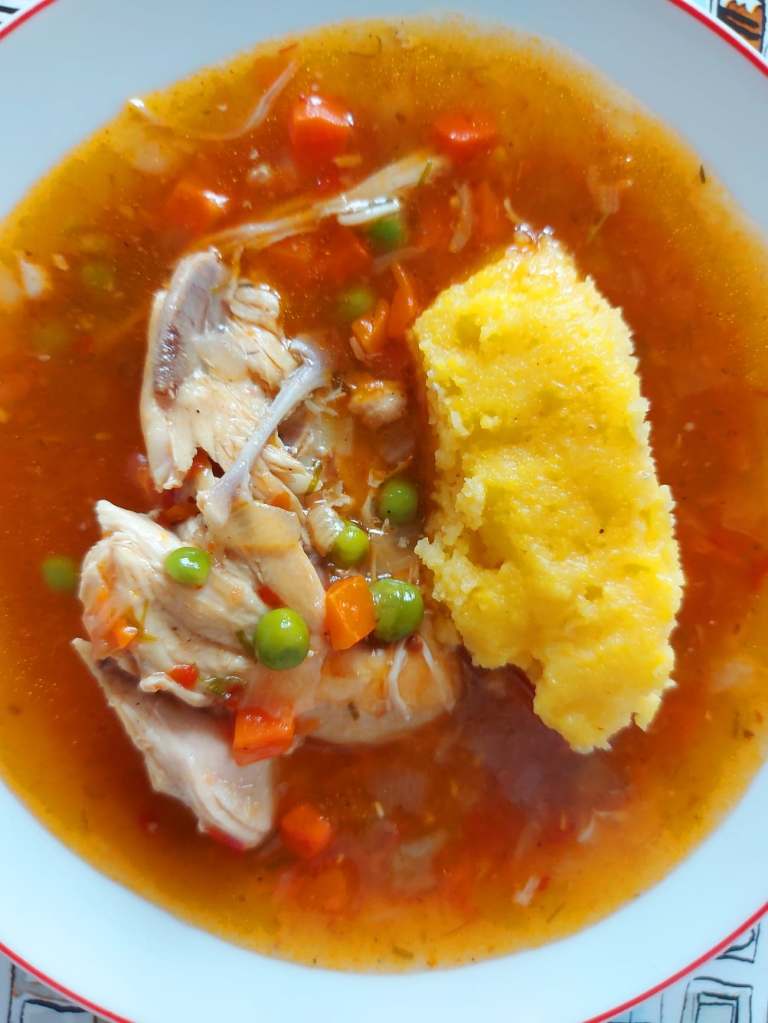 Tranșat de duminică, puiul nostru cel de toate zilele a ajuns o parte în tigaie, iar restul în oală. Mămăliga își serbează din nou ziua și e prezentă la masa noastră. De când am copil căruia îi place mămăliga, este nelipsită din meniu, și cel puțin, o pregătesc de două ori pe săptămână ceea ce la noi era o dată-n Paști, dacă îmi permiteți expresia. Pieptul de pui l-am tăiat felii felii pentru șnițele, iar restul cărnii am pus-o într-o oală la călit câteva minute. Am bătut două ouă peste care am pus sare, piper și mărar tocat; în altă farfurie am pregătit pesmetul. Șnițelele sunt gata de pus în tigaie. În continuare am tocat 3 cepe mărunt și 3 căței de usturoi pe care le-am adăugat peste carnea din oală, apă cât să acopere totul sub capac, 2 frunze de dafin, 2 linguri de bulion de ardei, și am lăsat să fiarbă carnea până se ia de pe os ușor. Întretimp prăjesc și șnițelele, ca să meargă totul odată. La final de mâncărică de mazăre cu pui, adaug un mix de mazăre cu morcov congelate în oală și un amestec din două linguri de amidon de cartofi cu 500ml de apă pentru 10 minute, sare piper și boia dulce. Voila!