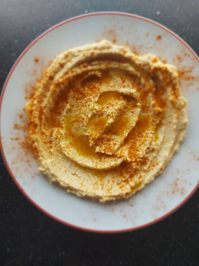 Nu vă speriați de felul cum arată farfuria cu numărul 2. Morcovii întotdeauna băiețelul meu îi mănâncă pe toți, iar eu îi pusesem așa pentru a se răcori puțin înainte să fie devorați de prichindel. Homemade humus pentru mic dejun, și păstăi de fasole verde cu pulpițe de pui la ‘cină’, avem pentru astăzi. Am scurs o conservă de năut într-o strecurătoare, zeama păstrând-o pentru mai târziu și am început rând pe rând, să dau coaja jos de pe bobițele de năut. Pentru a le zdrobi și pentru a avea certitudinea unei paste fine de humus la final, am folosit un mixer vertical. Într-un bol adaug boabele decojite, 2 căței de usturoi, o lingură de tahini (pastă de susan) pe care l-am cumpărat gata făcut dintr-un bazar arăbesc, zeama de la o jumătate de lămâie, sare, și mă ajut de zeama rămasă de la năut. Încep să blenduiesc turnând puțin câte puțin pentru a ajunge la textura dorită. Am pus totul pe o farfurie adâncă, am stropit cu ulei de măsline și puțin praf de boia. Merg de minune cu capere, însă eu nu am avut de data aceasta. La al doilea fel de mâncare, am pus într-o tigaie încinsă cu ulei niște păstăi congelate, rondele de morcov, un cățel de usturoi pisat și ceapă, peste care am turnat 3-4 linguri de apă și le-am acoperit cu un capac. Pulpițele le-am băgat la cuptor astfel încât să se facă odată cu legumele. Pentru un gust mai delicios, în loc de sare am pus sos de soia și peste carne, și peste fasole. Voila!