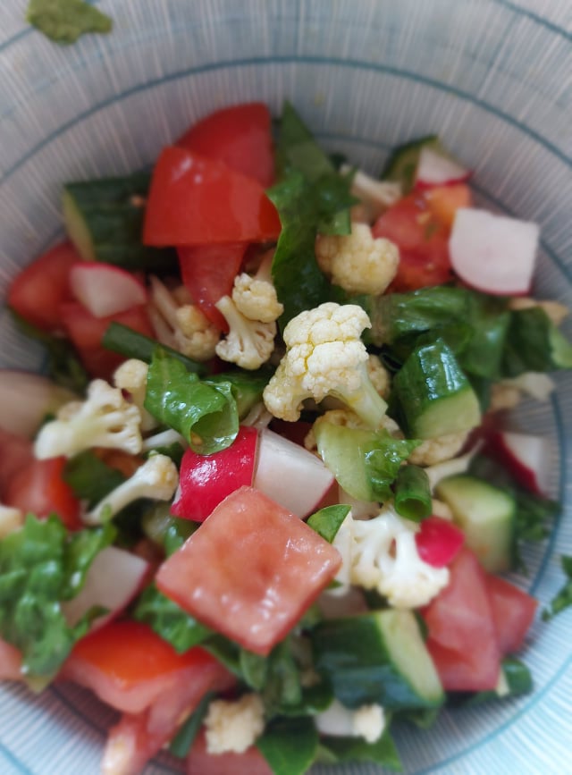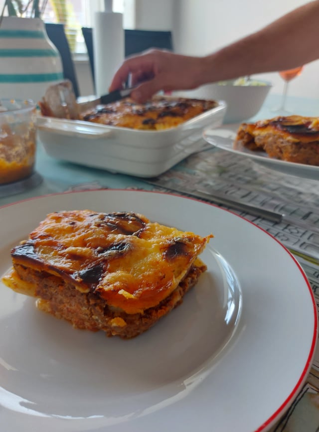 Salata nu ne lipsește de la nicio masă. Iar ca această rutină să nu devină plictisitoare și să atingă nivelul de saturație, combin legumele în diferite moduri pentru a evita să avem la masă același gust ca ziua precedentă. Astăzi este rândul conopidei să facă diferența și gramul de oțet balsamic pe care evit să îl folosesc de cele mai multe ori. În rest, e compusă cu ce am de regulă prin frigider. Câte puțin din fiecare: ridiche, multe roșii (aici nu se mai aplică regula ‘puțin din fiecare’), castravete, salată verde sau spanac, ceapă verde sau albă și lista poate continua. Cu ce am mâncat-o însă e marea surpriză. Musaca de cartofi cu carne tocată!!!! Pentru prima oară în viață am încercat-o. În schimb îmi aduc aminte când am mâncat-o pentru prima dată. Eram în vacanță la Tușnad cu părinții, iar la cantină unde mâncam seară de seară și unde mi se părea că e cea mai bună mâncare de pe pământ (eram atât de mică încât doar fazele astea mi le aduc aminte: când vizitam urșii seara și când mâncam la cantină, culmea, tot seara). Cum am gătit-o?! Păi se pun la fiert cu tot cu coajă cartofii. Câți vreți și câți puteți. Când mă uit la poza de jos am impresia că e lasagna și am greșit poza. Dar nu e. Să continuăm zic…am căutat eu mai multe rețete pe internet, apoi am ciugulit de ici o informație, de colo un ingredient secret, și le-am combinat pe toate după gustul meu. Sosul care va fi așezat printre straturile de cartofi fierți, răcoriți, curățați și feliați, va fi alcătuit din: carne tocată de vită, ceapă, suc de roșii, usturoi, morcov dat prin răzătoare bulion, cimbru, boia, sare, piper. Puneți carnea în tigaie, nu ceapa cum găsiți în toate rețetele, și o lăsați până se evaporă toată apa din ea, chiar prăjind-o puțin pentru a da un plus de gust musacalei. Se adaugă pe rând ingredientele mai sus menționate, plus apă și lăsăm să fiarbă jumătate de oră. După ce e gata, se lasă la răcorit. Pregătiți cartofii de asamblare și o tavă unsă bine cu unt. Acum că sosul s-a mai domolit, adăugați două ouă pentru a lega mai bine compoziția și nu riscați să se destrame când așezați preparatul pe farfurie. Un strat de cartofi, sosul și ultimul strat de cartofi. Aici am acoperit musacaua cu smântână bătută cu un ou și mozarella din belșug. Totul intră la cuptor până devine arămiu la culoare. Voila!