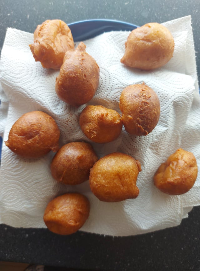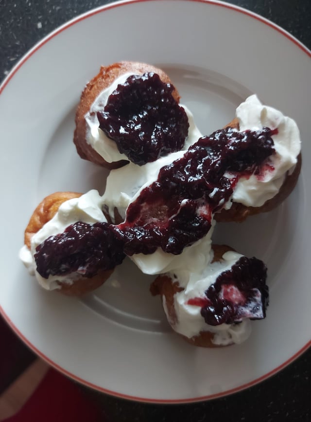Săptămâna asta am avut chef de gătit după cum vedeți după rețetele nou încercate de mine și nu am ales unele chiar ușor de executat așa cum îmi place mie. Dacă nu v-ați dat seama deja din poze, azi am încercat papanași biluțe decorați cu smântână cu 18% grăsime și dulceață de mure. Ori mi-a ieșit mie aluatul, norocul începătorului, ori rețeta acestui aluat de papanași este foarte ușoară și am trăit eu cu iluzia unei rețete complicate și că nu e de mine. Ingredientele pe care le-am folosit au fost în funcție de cantitatea de brânză pe care o aveam la momentul respectiv 300g mai exact de branza de vaci homemade, 2 ouă, bicarbonat de sodiu, zeamă de lămâie, făină, zahăr, ulei. Am stins o linguriță de bicarbonat de sodiu cu zeama de la jumătate de lămâie în castronul în care o să pregătesc aluatul pentru papanași. Adaug brânza. Încep să mixez încet la mixer și adaug pe rând cele două ouă, două linguri de zahăr și 160g făină. Trebuie să ajungeți la o textură a aluatului nici foarte moale, nici foarte tare, și să fie ușor lipicios. Am pus mult ulei la încins în ceaunul pentru mămăligă, la foc mediu spre mic, și m-am ajutat de două linguri pentru a forma biluțele. La sfârșit le-am servit cu smântână și dulceață. Voila!